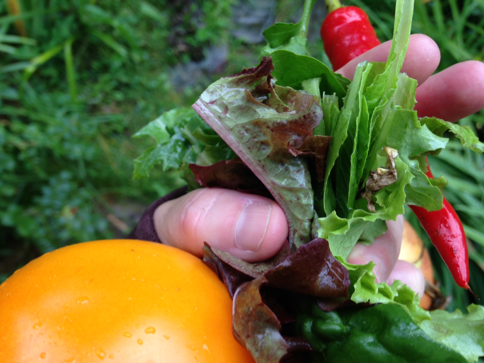 A once-upon-a-time philosophy major, I’m capable of writing up a fury of abstraction, but, really, the gem of Fenollosa’s writing is its concreteness. This afternoon, walking in a foggy rain laced with hues of yellow and red leaves, I picked a cucumber, a brandywine, a crimson red pepper – those jewels of pepper plants keep giving – a handful of mesclun. Separate, discrete things? Or all joined in my arm, in my garden, beneath this misty veil, at this turning place in the season?