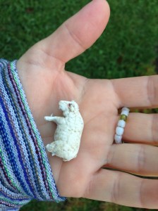 My archeological find, near the barn’s ramp, is good child’s play area, near the house but not too near, cool in grass in the summer, with the cement a fine place to spread out small toys. Orange tiger lilies and silver-lavender allium spread tenaciously along the barn’s side, and I’d like to think some small child knelt in the grass there, happy to be home from school, entranced in the roaming world of her or his ram and animal companions. I’d prefer to think this creature, its back legs gnawed or worn at its hooves, wasn’t discarded carelessly.