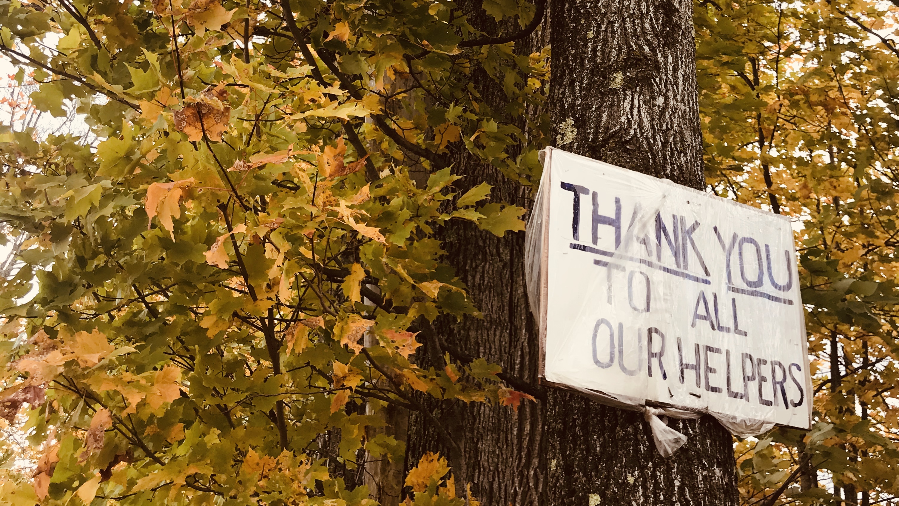 On my way to a bone-chilling soccer game, I stopped by the side of the road to snap this photo. Harvest helpers? Essential workers? I hardly cared — a nice sign on a backroad in the midst of so much nasty rhetoric. Maybe simply a thank you to the universe.