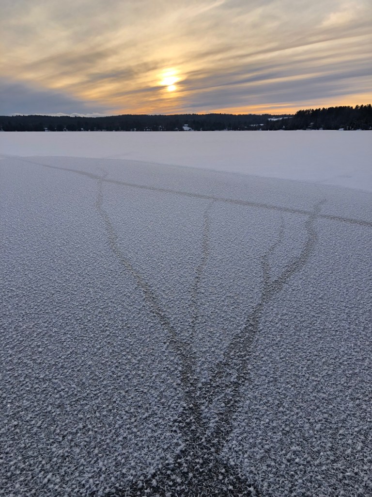 Live in New England long enough, and you crave the return of ice, the experience of cold and clean winter, the turning around of seasons. The ice will pass, too. Cold, I crouch at the ice’s edge. A squirrel skitters out of the hemlocks and chitters at me before scampering off. Then it’s just me for a moment, and all that sky and the mysteries of the frozen lake. In January, the days give cold and a few extra minutes of sunlight….
