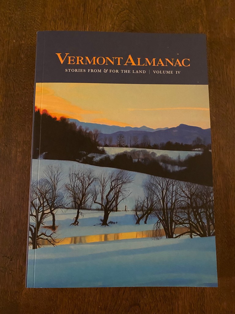 My copy of the fourth Vermont Almanac arrives in my mailbox. Remember real mail? I remember exchanging long letters with friends for years. Email is fine and dandy, but email has no smell. I open the book in my kitchen and breathe in the scent of ink and paper. I was fortunate to write and edit a bit for this issue.
