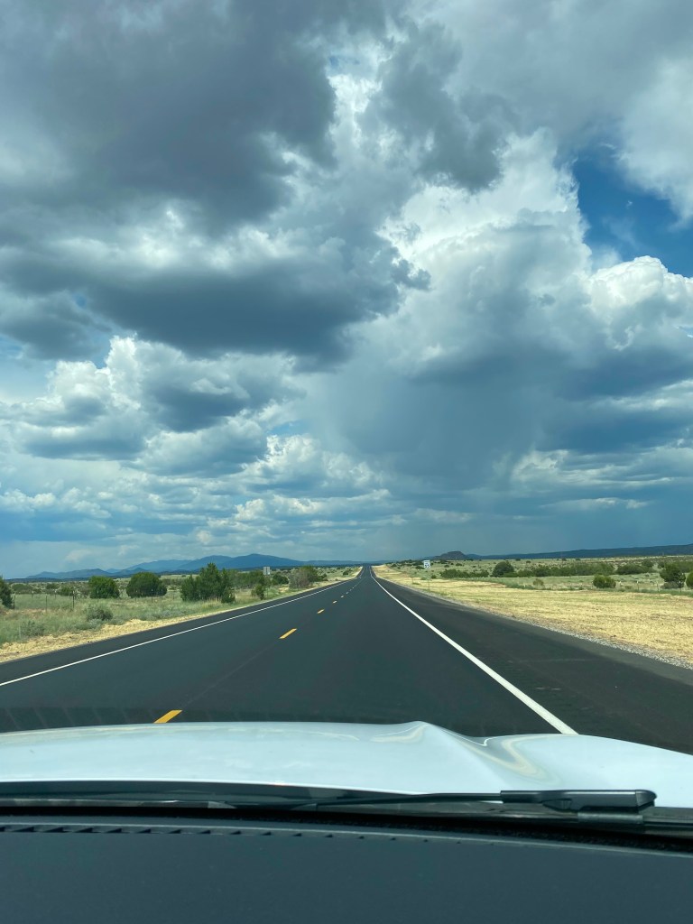 My daughter sends word of rain and more rain in our Vermont world. Meanwhile, on the other side of the continent, visiting my father in New Mexico, we’re amazed by the hues of green. The desert’s rainy this year, too. In the afternoon, I work outside while a storm blows in. In New Mexico’s wide skies, sooty clouds may lower and threaten and yield not a drop of water, blowing elsewhere, breaking or not.