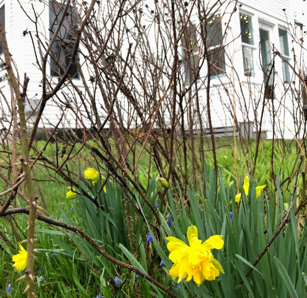 I’ve met the staff on my annual pilgrimage there. They all speak quietly, as if our words might disturb the rows of potted currents and grapes. I ask again for planting advice. As I listen, I suddenly realize I’ve gone at this tree planting and cultivating thing all wrong. Beneath my trees, I should create a forest garden of duff and broken up straw and that humus-y compost that plants must love like chocolate. Daffodils bloom in the gardens beneath their trees.