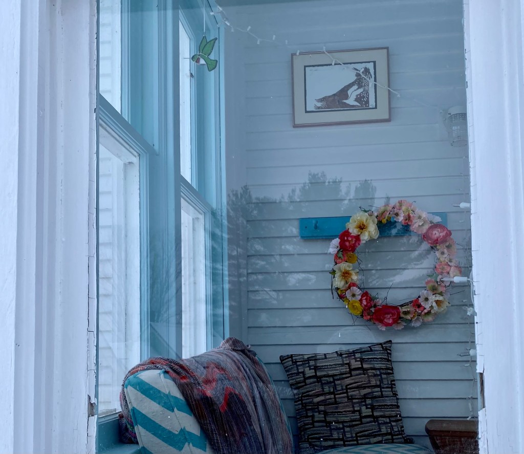 One of my favorite parts of our house is the small glassed-in porch at the bottom of the stairs, just large enough for two small loveseats. In this high school graduation weekend, we’ve spent a lot of time hanging out, talking, talking, the weather alternately switching from cold rain to sparkling sun. The cats sequestered themselves on the stairs while my daughter’s dog lingers around her feet. The dog wants to play. The cats cherish their dignity. The humans hover around this heartfelt drama.