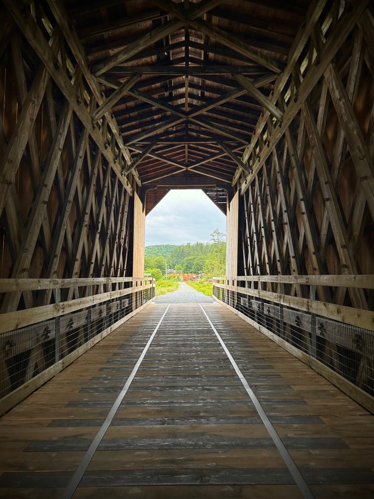 I walk back slowly on that trail, under the cool shading trees. Chicory, knapweed, Canada lily. In the covered railroad bridge, I pause in its interior dimness, light at either end. There’s no one around at all. I soak it in.