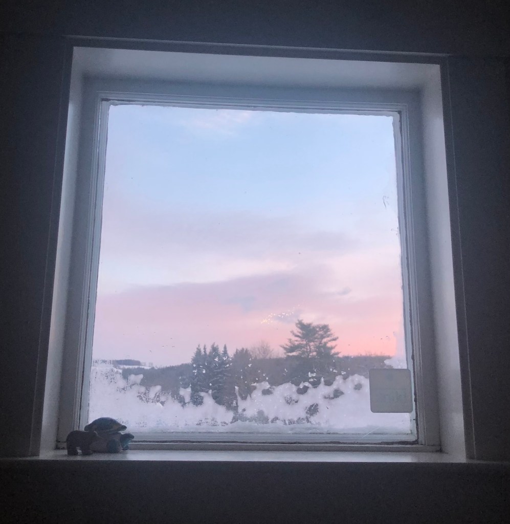 Four degrees this morning. I’ve experienced forty below zero, but, good lord, four degrees is not compatible with prolonged human exposure. I carry the stove ashes out and stand for a moment, a few snowflakes drifting down from the darkness, illuminated in my kitchen window’s electric light. Below me in the valley, the scattered lights of the village glow: power still on here. All night, wind threw handfuls of icy snow at our windows. I lay awake listening and reading, my cat curled on my bed, wary of my visiting brother’s dog.
