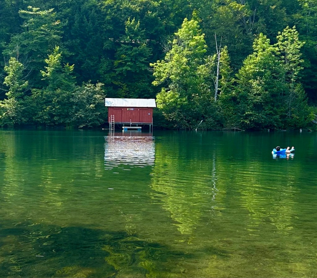 Hurrying from one thing to another, I detour to my favorite swimming pond, under these overcast skies. A woman and a little girl are swimming. There’s no one else around, and the woman and I chat about the fish nibbling our toes. The girl sits on a floatie shaped like a chocolate ice cream cone and looks skeptically at us, as if her mother and I might be making up everything. Maybe, in truth, our toes are bleeding from fish fangs. The child is taking no chances. She leans back on the floatie and stares up at the sky. Her mother gently pushes her from shore.